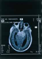 An axial MRI revealing a large, chiasmal tumor in a patient with advanced nuclear cataracts. Fields were never performed and the patient's visual symptoms were all attributed to his cataracts.