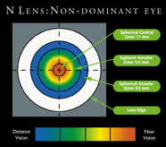 The real advantage to this lens design involves the integration of a distance-centered lens for the dominant eye and near-center lens for the non-dominant eye. The distance-centered lens integrates a 2.3 mm spherical distance prescription; the near-centered lens has a 1.7 mm spherical near prescription in the center. The distance center lens design usually needs a +0.25 added to the distance prescription while the near-centered lens requires -0.25 added to the distance prescription.