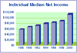 To add perspective, we can adjust income to inflation levels. By adjusting the mean total individual net income to the 1998 CPI level, we can see that income grew from $66,000 in 1998 to $96,000 in 2000.