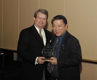SECO President Dr. Bill Spearman presented Dr. Stan Yamane, vice president of Professional Affairs at Vistakon, with a President's Award for meritorious service to the profession during the recent SECO International 2004 (see photo at right).