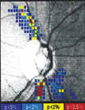 In addition to the abnormal NFI, many of the temporal, superior, nasal, inferior, temporal (TSNIT) parameters were abnormal as shown by the color-coded probability symbols (see Figure on page 24 and below). The deviation map revealed focal areas of RNFL reduction, also depicted by color-coded probability symbols.