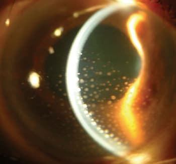 Note the many, large keratic precipitates in this uveitis patient. |