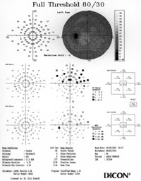 As for our patient, her peak untreated IOP was 16mmHg O.U., so I set a target IOP of 11mmHg, about 30% lower. I prescribed Betoptic S (betaxolol hemihydrate, Vistakon) O.U. bid, but this only lowered IOP to 13mmHg. I changed her medication to Xalatan (latanoprost, Pfizer) O.U. qhs and the IOP reached 11mmHg with great consistency. Despite this "good" IOP, the patient developed a VF defect three years later (See VF images at left). Rather than add another drop, which may have affected her compliance, I opted to try Lumigan (bimatoprost, Allergan) O.U. qhs, in place of Xalatan. This helped achieve a consistent IOP under 10mmHg.