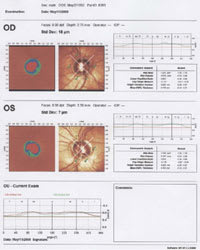 | Top: The Moorfields Analysis printout from the HRT II reveals several suspicious sectors in both eyes. Bottom: The GDx VCC printout shows the retinal nerve fiber layer (RNFL) reduced in thickness. |