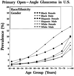 The prevalence of POAG in the U.S. begins to increase around age 40 in most racial and ethnic groups. |