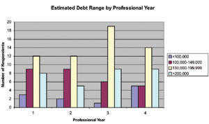 If debt is not a factor, desire for solo practice upon graduation appears to decrease with professional year; however, solo practice was still the most preferred practice mode. The average respondent with greater than $200,000 of debt was between ages 20 and 25. Although one may assume older students have increased debt secondary to greater responsibilities, the survey showed older students had decreased their overall debt. The majority of respondents said they will graduate with $150,000 to $200,000 of debt (see table on page 91). The lowest debt category had the fewest respondents.