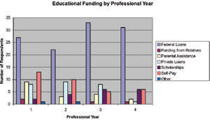 The majority of students financed their optometric education with federal loans (see table on page 88). The number of respondents who financed their education themselves had the same results in each debt category. However, with increasing professional year, fewer respondents financed their education them- selves. Those who received funding from relatives had the least amount of debt. If debt was not a factor, no students chose corporate as their preferred practice mode choice.