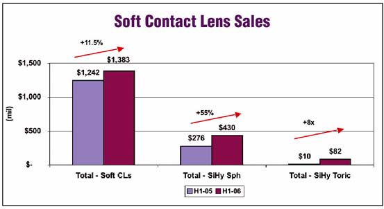 As was largely the case in the two years pri-or, SiHy lenses were once again the primary drivers of this strong retail growth, with sales of all SiHy lenses (including spherical, toric and multifocal) growing in excess of 80% during the first two quarters of the year vs. an estima-ted 10% decline in standard/HEMA-based soft contact lenses through the same period. There was an estimated 55% growth in spherical Si-Hy lens sales and a more than eightfold increase in toric SiHy lens sales (to more than $80 million at the retail level vs. roughly $10 million at retail in the first half of 2005), but only two SiHy torics have been on the market since mid-to-late 2005, so the 2006 eightfold growth isnt necessarily something to write home about.