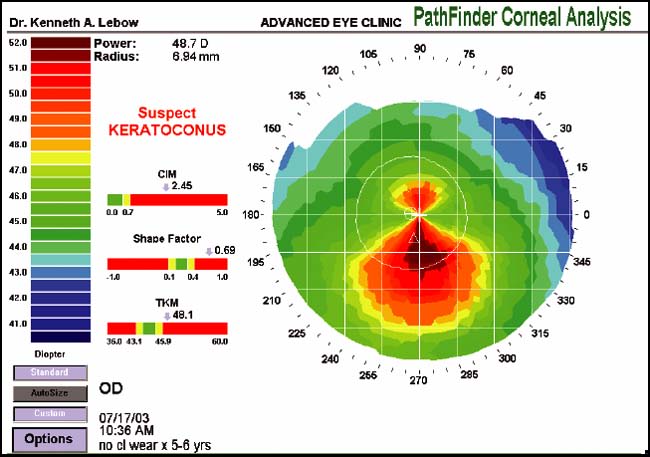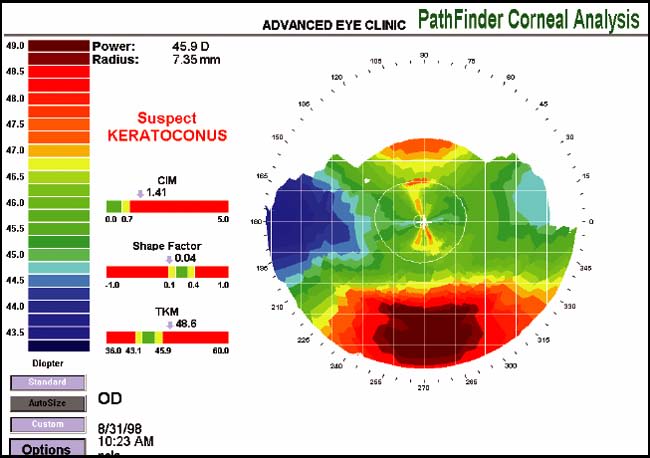 A corneal topography map in this circumstance often reveals a subtle deviation in corneal shape, which may account for the patients reduced acuity. Although this patient didnt fit the typical keratoconic profile, the map did indeed reveal an unusual keratoconic-like pattern, which adversely affected his vision. This patient was diagnosed with sub-clinical keratoconus.