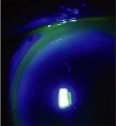 A corneal transplant patient was left with an oblate corneal shape (SF = -1.20) with significant corneal astigmatism. A relatively steep, large reverse geometry lens achieved a reasonably aligned base-curve-to-cor-nea fitting relationship, in spite of the excessive corneal astigmatism (see figure 7). When fitting transplanted corneas, your goal should always be to achieve as close to an alignment pattern as possible, realizing that this may not always be realistic, especially in cases of severe astigmatism. Figure 8 demonstrates the axial and elevation maps of a transplanted cornea with just over 20.00D of tor-icity. For cases like this one, unusual fluorescein patterns are quite typical, and problems with edge standoff are the rule rather than the exception.