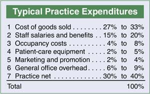 Regular readers of my column know that I like to organize the overhead structure of a traditional practice (that dispenses glasses and contact lenses) into seven categories (see sidebar). These numbers indicate the average percentage range of annual collected gross revenues that a typical practice devotes to each item.