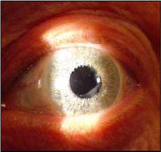 In my experience, air-bag injury is quickly becoming the most common injury that requires a cosmetic lens. The discharge of an airbag into the face can result in a blown pupil. Ive found that this is a monocular event. The patient then presents with two problems: the cosmetic problem of unequal pupils and the glare from constant dilation on the affected side. Its critical to ascertain which of these problems is most troublesome. Many practitioners just assume that glare is the major issue when in fact, its more often the cosmetics. For patients with cosmetic issues, the first choice in management is the disposable iris changing lenses. You can fit this lens in the affected eye or in both eyes depending on iris color and patient preference. Although these lenses dont provide much in the way of light control, the cosmetic effect is quite good.