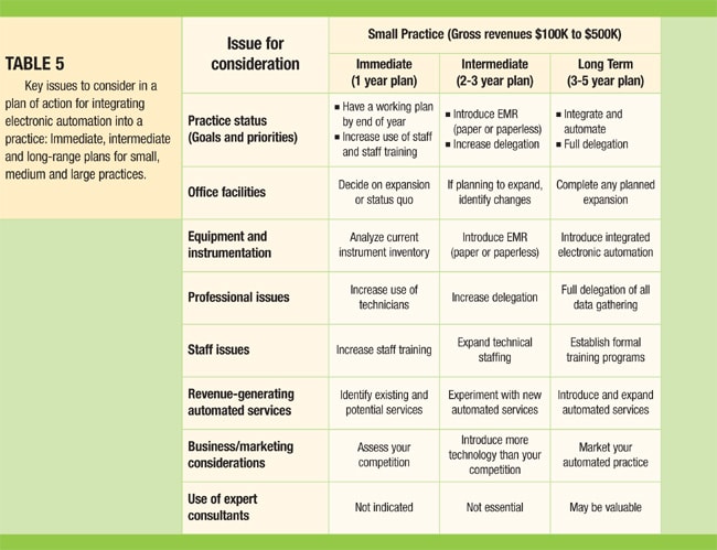 Table 5 is a chart of some of the key issues to consider in the immediate, intermediate and long-range planning for a small, medium or large practice. This is a limited list of general issues with general suggestions. A much more expanded list ultimately will be required in your planning, but this may help get things started in a positive direction.