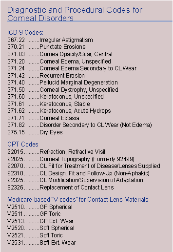 Something else to consider: The new ICD-9 code 92025 now allows billing for the procedure of corneal topography. Providing proper documentation in the form of appropriate topography maps facilitates reimbursement (see "Diagnostic and Procedural Codes for Corneal Disorders," page 36).