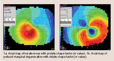 The axial map also generates the shape factor. Shape factor (P) measures the asphericity of the cornea and is a derivative of eccentricity(e). These values can be converted by the equation P=e2. A positive, high-value shape factor (prolate shape) is evident in keratoconus, while a negative or low-value shape factor (oblate shape) is indicative of PMD (see figures 1a and 1b, page 36). The tangential map helps "pinpoint" the shape and location of the cone in keratoconus.