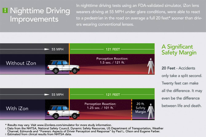 A clinical study showed that iZon lenses provided wearers with the ability to react more than 20 feet sooner at 55 miles per hour than when wearing conventional lenses. The night driving simulation included 12 tests, where the subject had to detect and then identify potential hazards. The tests included glare and nonglare conditions. In all 12 tests, the iZon Lens held an advantage for improving reaction time, with 10 of the tests being statistically significant. For example, in one of the tests, involving a pedestrian near the highway under glare conditions, the iZon lens provided an improved reaction time of 0.25 seconds or a 20-feet shorter stopping distance when traveling at 55 mph. This is better than one full car length, which could be the difference between life and death. |