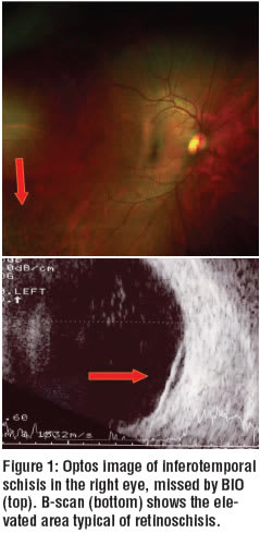 Imaging with the Panoramic 200 revealed a larger, but flatter inferotemporal retinoschisis in the patient’s right eye. This was missed by BIO on previous examinations (see figure 1).