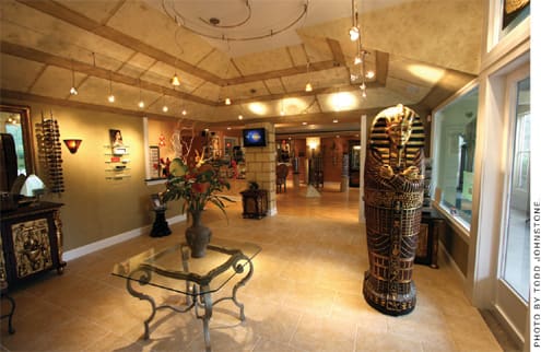Optometrist Jacqueline Campisi, of Visions Sight & Learning Center in Mystic, Conn., says the most outstanding part of her Egyptian-themed practice is the pyramid-shaped waiting area and domed ceiling of the optical boutique (right). "A floor-to-ceiling mural of a doorway peering out at the desert backdrop from the pyramid catches patients' eyes as they approach the reception area," she says. "Wall sconces produce a low amber glow, as if the pyramid were lit by torches, and frame displays are made from imported Egyptian furnishings." The location of Dr. Campisi's practice was key to her success. Situated in the lower corner of a medical complex, the practice has 40-feet of window frontage facing a Starbucks.