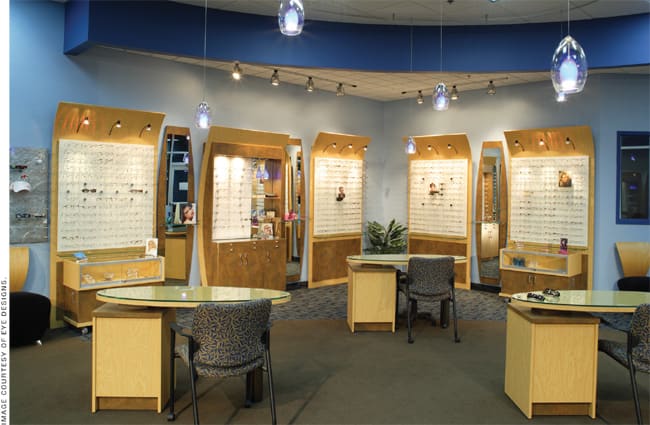 Dr. Osnes' optical also features high ceilings with curved fixtures, hanging accent lighting and lots of space. "The traffic pattern is very efficient," he says. "The optical frame boards, furniture, fixtures and lighting create an inviting area for our opticians to fulfill our patients' eyewear needs."