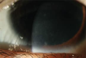 A 3mm epithelial defect was present within the central haze, with an associated infiltrate.