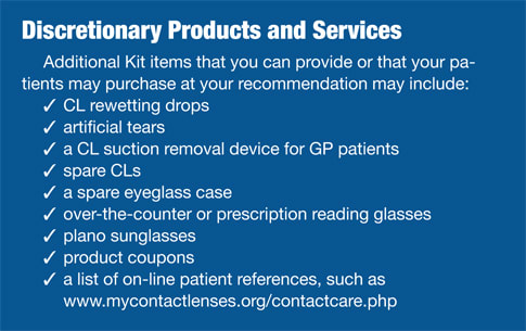 The CL Tool Kit is the new wearer's survival guide and, as such, functions as a critical patient-management aid. It provides, among other things, a concise and handy review of all the information you and/or your conscientious CL technician meticulously impart to your patient at the dispensing visit. Considering just how much (or little) additional information a patient who is nervously and self consciously practicing CL insertion and removal can simultaneously absorb in a typical half-hour session, this take-home kit is invaluable for instilling compliance to your wear and care instructions. While the kit should include the same basic components for all wearers, customize it according to CL type (wearing modality) and care regimen (i.e. solution), as both determine appropriate wear and care.