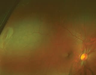 The Optomap Retinal Exam shows a new retinal hole (reddish oval, far right) at the 9 o'clock position in the right eye, just posterior to the ora serrata. Clinical summary: The patient chose to have an Optomap Retinal Exam that appeared to reveal two small retinal holes at approximately 8 o'clock in the right eye just posterior to the ora serrata. Because of this finding, I performed a dilated fundus exam (DFE) with scleral depression, confirming the diagnosis of two atrophic retinal holes in that location with no surrounding fluid cuff.I referred him to a retinal specialist who confirmed the diagnosis. Because the patient had no symptoms, there was no fluid cuff around the holes, and prophylactic laser treatment could induce more retinal holes, we decided to carefully monitor the retina for new changes or symptoms every 6 months. At the most recent routine eye examination, the patient hadn't had any retinal changes (as observed with DFE and scleral depression) for 3 years, so we chose an Optomap Exam in lieu of dilation. Unfortunately, the new Optomap image appeared to show a previously undiagnosed atrophic retinal hole at approximately 9 o'clock just posterior to the ora serrata. Because this was a new finding, we performed a DFE, confirming an atrophic retinal hole. Prior Optos images showed that this retinal hole wasn't present in past exams. Patient outcome: This new retinal finding prompted me to refer the patient to a retinal specialist to reconsider prophylactic laser treatment for these retinal holes. We're awaiting the retinal surgeon's treatment decision. Case 2 Patient history: A 21-year-old, slightly overweight Caucasian woman with no other reported health problems had a routine eye exam for contact lenses. She said her distance vision had been decreasing gradually in both eyes over the previous year, which she attributed to a normal prescription change over time. Clinical summary: This patient chose to have an Optomap Retinal Exam just as she had done in the prior 2 years. Her best-corrected acuity was 20/20 OD and 20/20-3 OS through a moderate compound myopic astigmatic spectacle prescription. Anterior segment biomicroscopy revealed no remarkable findings. An undilated fundus exam with a superfield lens revealed slightly elevated and nondistinct optic discs in both eyes, with a cup-to-disc ratio of 0.2/0.2 in both eyes. There was a spontaneous venous pulse in both eyes. All other fundus findings were unremarkable. On previous exam charts, her optic nerves had been recorded as distinct and flat and her cup-to-disc ratio had been recorded as 0.3/0.3 in both eyes. Because of these suspected changes in the optic nerves, I needed to rule out recent onset of papillitis. I reviewed the Optomap scans from the past 2 years.
