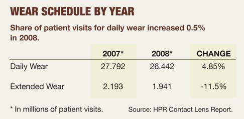 In 2008, patient visits for extended wear schedule CLs declined about 11%, while patient visits for daily wear schedule CLs grew almost 5% — a trend continued from the 2007 HPR data. (See "Wear Schedule By Year," below.)