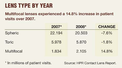 The more demanding a patient's vision needs, the more loyal the patient — or so HPR's data indicated. Actual patient visits for toric lenses declined 1.8% in 2008, but this decline was less than that for spherical lenses. Patient visits for multifocal CLs reflected a net gain over 2007 of almost 15%. (See "Lens Type By Year," below).
