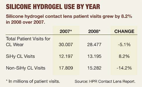 "The trend for the last five years is that an increasingly higher proportion of patient visits are for SiHy lenses," says Molly Thompson, an associate director of client solutions at HPR who tracks the data monthly and regularly converses with CL companies. In fact, 46% of patient visits were for SiHy CLs in 2008.