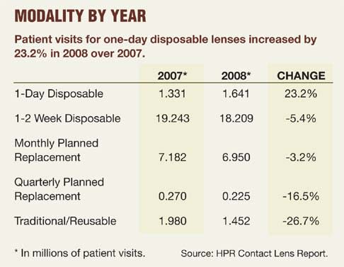 Although patient visits for contact lens (CL) wear declined about 5% in 2008 from 2007, the CL market continued to see areas of growth and an extension of certain trends, revealing its strength in challenging times.