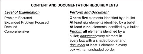 The Examination requirements are shown in Figure 1. Each bullet identifies an element that the practitioner must perform if that element is to be counted toward the level of the examination. No substitutions are allowed — you cannot take elements from other single organ systems and count them as eye examination elements. A total of 14 elements are identified by a bullet. At the highest level, all 14 have to be performed.