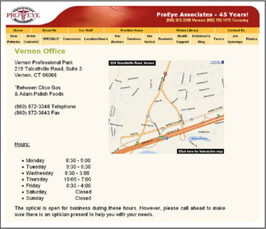 Pages on the ProEye Associates Web site (Keith E. Watson, OD, ME) provide patients with office hours and locations and include interactive maps.