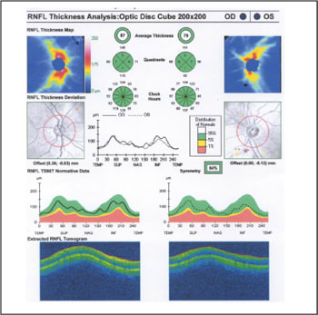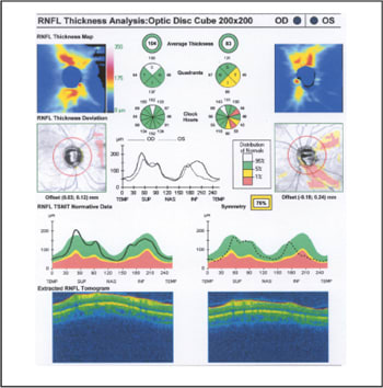 I also look at the temporal-superior-nasal-inferior-temporal (TSNIT) analysis, which compares the patient's measured data to a normative database. Where patient results depart from normal, I have to look more carefully at the disc in those areas and check for corresponding visual field deficits (Figure 4).