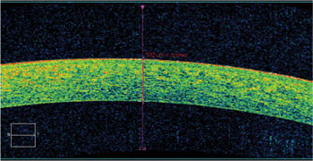 • Cornea: SD-OCT has many capabilites when it comes to the cornea. Using this technology, we can see the epithelium, the tear layer, Bowman's membrane and even the endothelium. We can evaluate the homogenous clarity of the stroma. We can even measure corneal thickness virtually anywhere on the cornea (Figure 2).
