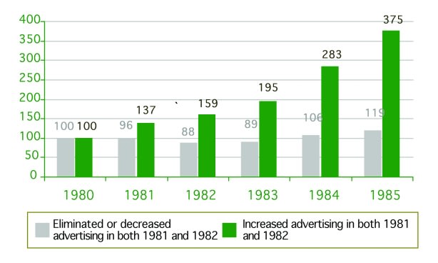 Ryan B. Advertising in a recession: The best defense is a good offense. Value of Advertising Committee, American Association of Advertising Agencies, 1991. Meldrum and Fewsmith. How Advertising in Recession Periods Affects Sales. American Business Press, 1979. McGraw-Hill Research. Laboratory of Advertising Performance Report 5262. New York:McGraw-Hill, 1986.