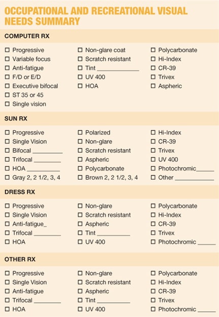 ► Do you ever have problems with glare interfering with your vision? Patients who answer yes to this question would benefit from antireflective (AR) coating and polarized sun lenses.