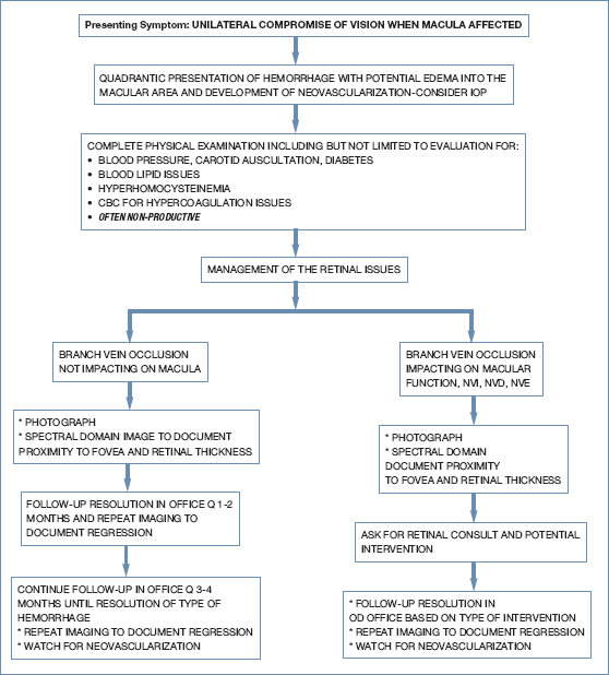 | Retinal Vein Occlusion is a relatively common cause of vision compromise associated with the possibility of macular edema and retinal ischemia. I've found that branch vein occlusion is three times more common than central vein occlusion with both more common in patients age 60 and older. Ocular ischemic syndrome may present as a variant of central retinal vein occlusion, and internal carotid disease must be considered in the diagnosis. Symptoms of branch retinal vein occlusion are largely dependent on the location of the occlusion and the subsequent impact on macular function. Neovascularization of the retina and optic nerve may occur with ischemia. Elevated intraocular pressure may also have an association with vein occlusions. The following algorithm may be altered based on the primary-care optometrist's discussion with the retinal specialist and his or her comfort level.