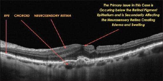 This photo shows retinal pigment epithelial disease with probable underlying choroidal disease. The process is creating outer retinal edema lifting both the RPE and the neurosensory retina. Without knowledge of clinical anatomy, alteration of that clinical anatomy and the implications of that alteration, the primary-care O.D. cannot effectively diagnose nor comanage patients who have vitreo/retinal disorders.