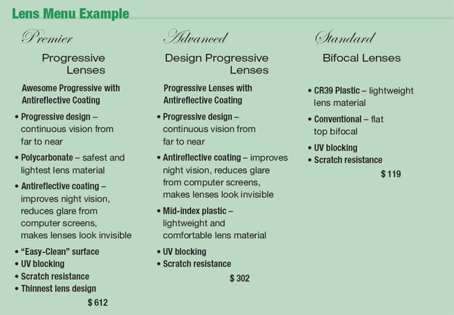 From here, your optician would present the patient with a menu that includes three packages for progressive and single vision lenses. This way, the patient can compare and contrast between what is “good, better, best,” or “premium, standard and budget,” or whatever descriptions you choose. (See “Lens Menu Example,” below.)