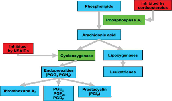 Arachidonic acid is the primary chemical that initiates the inflammatory cascade. Corticosteroids work by inhibiting phosophlipase A, which prevents arachodonic acid accumulation. Nonsteroidal anti-inflammatory medications work further downstream in the cascade by blocking the COX enzyme, preventing the release of chemicals such as prostaglandin into the bloodstream (Figure 1). Cyclosporine A is a potent immunomodulator and acts by inhibiting T-cell maturation, thus suppressing inflammatory mediators.