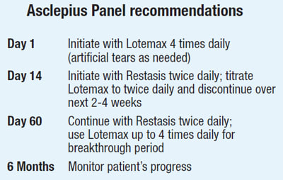 In 2006, the Asclepius Panel met to decide treatment regimens and therapy initiations based on the Delphi Panel 2004 scales for dry eye. Their recommendations were to institute corticosteroids in conjunction with Restasis earlier (less severe dry eye) for long-term treatment and management (see chart at right). As you can see, starting a steroid (Lotemax) q.i.d OU for 2 weeks then tapering it and adding Restasis seems to be common treatment for moderate to severe dry eye. One of the reasons to start Lotemax initially is because it not only sequesters inflammation quickly, but one study discovered that pretreatment with Lotemax decreased stinging of Restasis by 75%.16