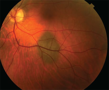 A Caucasian male in his 60s recently presented for his routine eye exam. The patient was relaxed and happy, and I was rewarded with a satisfying “Oh wow! That's so much clearer!” at the refraction's end. It was the kind of exam that makes you glad you practice optometry. But, during the posterior segment dilated fundus exam, my heart sank. There, as plain as day, was a large, raised lesion in the posterior pole. It was mostly non-pigmented, but it had a small area on the nasal border that was dusky-gray. I didn't detect any vascular abnormality on or near it, and there weren't drusen overlying it. Overall, it looked ominous. My mind began picking its way through its filed-away facts about choroidal lesions, so I could arrive at a diagnosis and determine the best management for the patient.