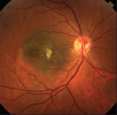 Fundus photograph of a suspicious choroidal nevus in a subfoveal location. This patient's nevus was suspicious due to the presence of orange pigment, subretinal fluid (note the track of old fluid inferotemporal to the nevus), location in the posterior pole and symptoms of metamorphopsia (due to the subretinal fluid).