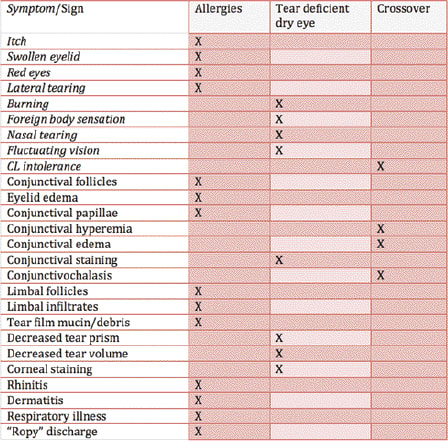 Figure 1 lists the common signs and symptoms of allergy and dry eye, including those symptoms that crossover and may apply to both pathologies.