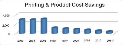 Figure 1 shows the reduction in costs, in dollars, of printing exam forms, file jackets, labels, appointment sheets, prescription pads, ledger sheets and superbills. (Costs for 2011 include expenses through Nov. 26.)
