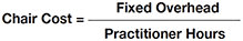 If the overhead per month is $12,450 and the total practitioner hours per month are 240, the chair cost is $51.87/hour ($12,450/240 hours).
