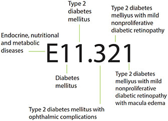 The ICD-10 format starts from left to right with increasing specificity, beginning with the systemic category and drilling down into specific structure detail. This is easy to see in the breakdown of diabetic retinopathy.