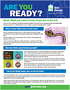 Though the risk of contracting Ebola in the U.S. is low, it is still important to arm yourself and your patients with information on transmission, symptoms and precautionary measures. In an advisory statement, the AOA urged doctors to direct both patients and staff to the American Public Health Association (APHA)’s “Ebola: What you need to know if you live in the U.S.” fact sheet, which includes frequently asked questions. The fact sheet (below) can be downloaded for free on the APHA website: www.getreadyforflu.org/EbolaFacts.htm.