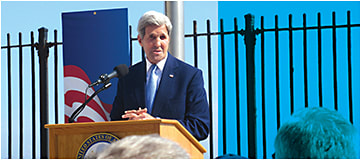 After 56 years, President Obama reestablished diplomatic ties with Cuba. (See photo of John Kerry above speaking in Cuba.) This has resulted in American tourists hoping to visit the once forbidden Caribbean Island. And now you can — if, that is, you are part of a scheduled tour group. This is what my wife and I did. Specifically, we visited Cuba under an “art” license, which took us to several Cuban artist studios, among other sites. (Obtaining the paperwork for legal travel took several weeks.) Here, I discuss the people, food and sites.