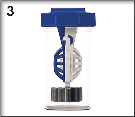 The two-tone contact lens case, from Alcon, is a consumer-friendly case with marked packages of CLEAR CARE Solution. The case features blue and white coloring to help patients differentiate between left and right lenses and tabs on the lens baskets for easy opening.